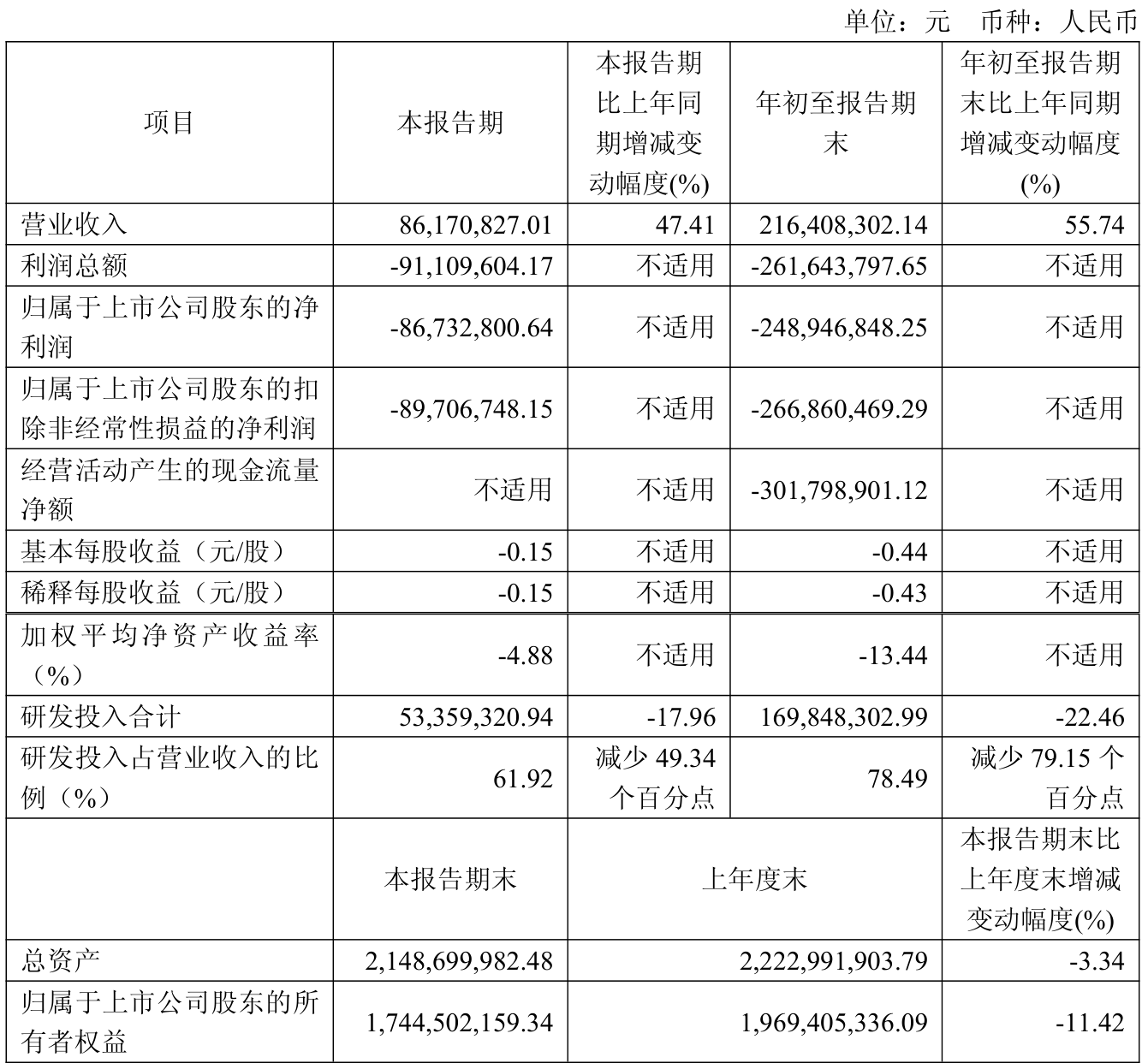 中证智能财讯亚虹医药(688176)10月30日披露2025年第三季度报告。前三季度公司实现营业总收入2.16亿元,同比增长55.74%;归母净利润亏损2.49亿元,上年同期亏损2.71亿元;扣非净利润亏损2.67亿元,上年同期亏损2.86亿元;经营活动产生的现金流量净额为-3.02亿元,上年同期为-3.25亿元;报告期内,亚虹医药基本每股收益为-0.44元,加权平均净资产收益率为-13.44%。