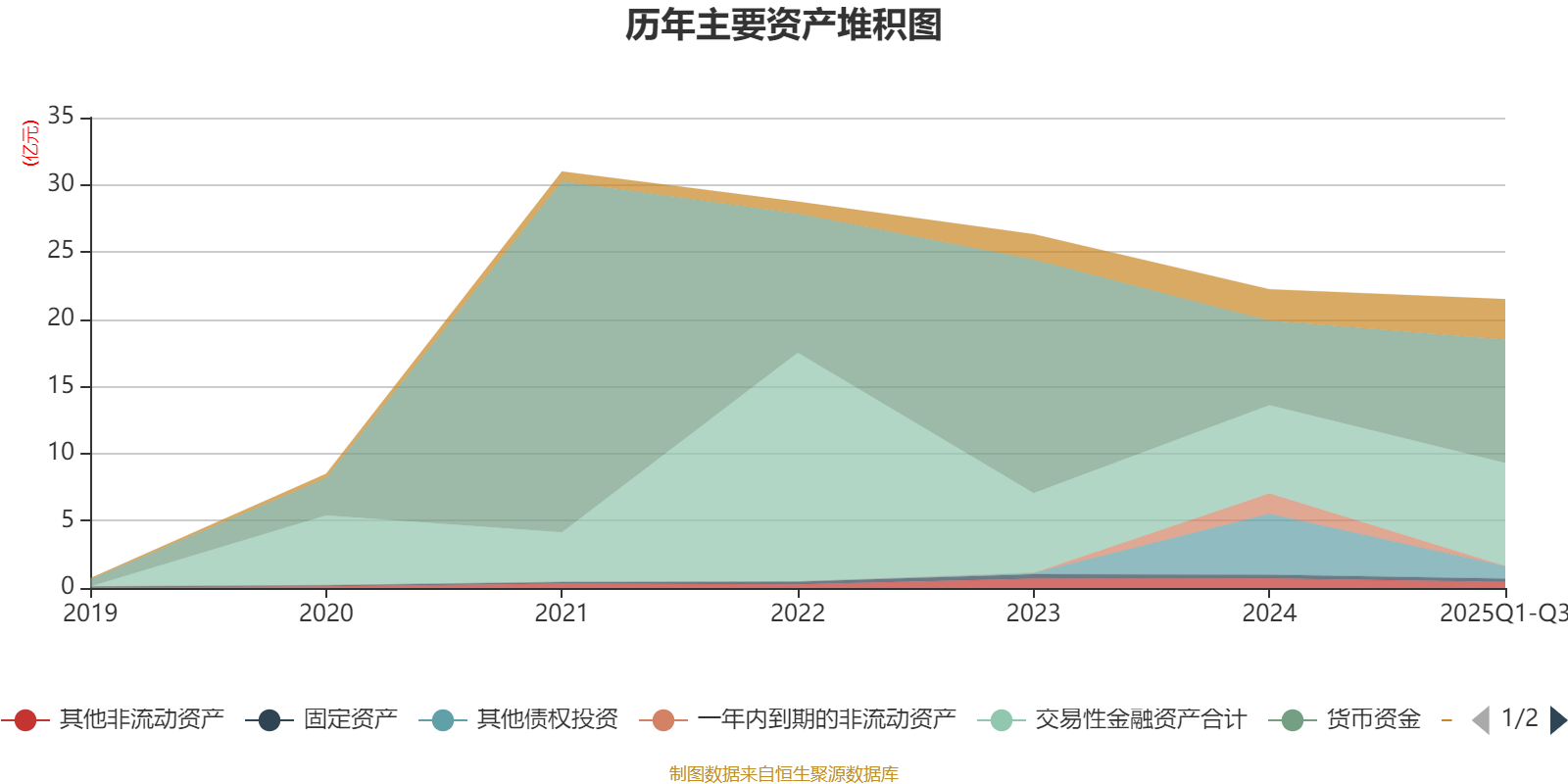 资产重大变化方面,截至2025年三季度末,公司其他债权投资较上年末减少79.32%,占公司总资产比重下降16.05个百分点;货币资金较上年末增加46.32%,占公司总资产比重上升14.52个百分点;一年内到期的非流动资产较上年末减少100%,占公司总资产比重下降6.77个百分点;交易性金融资产合计较上年末增加16.67%,占公司总资产比重上升6.12个百分点。