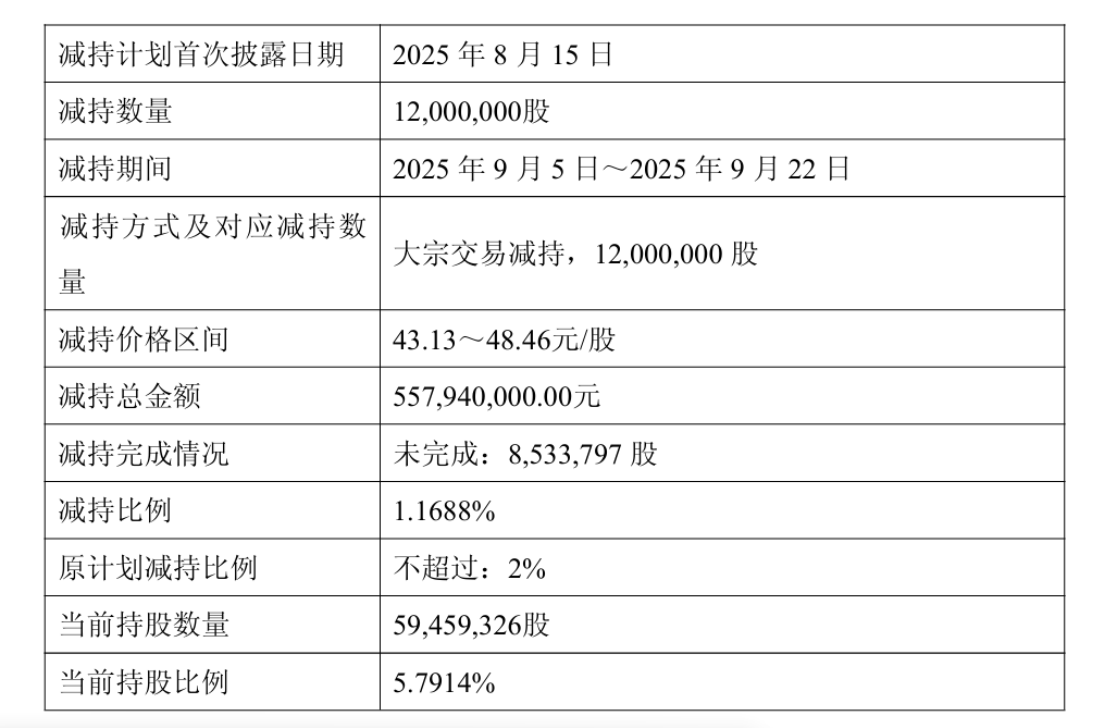 公告显示,上海檀英减持价格区间为43.13~48.46元/股,减持总金额约5.58亿元,减持原因为基金期限与流动性资金安排。
