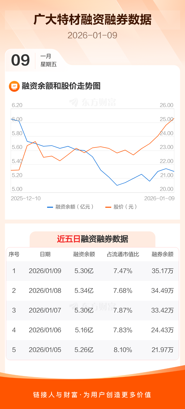交易所最新数据显示,广大特材于2026年1月9日获融资买入7505.03万元,融资偿还7936.91万元,当日融资净偿还431.88万元。目前,该股融资余额5.30亿,占流通市值比例为7.47%。