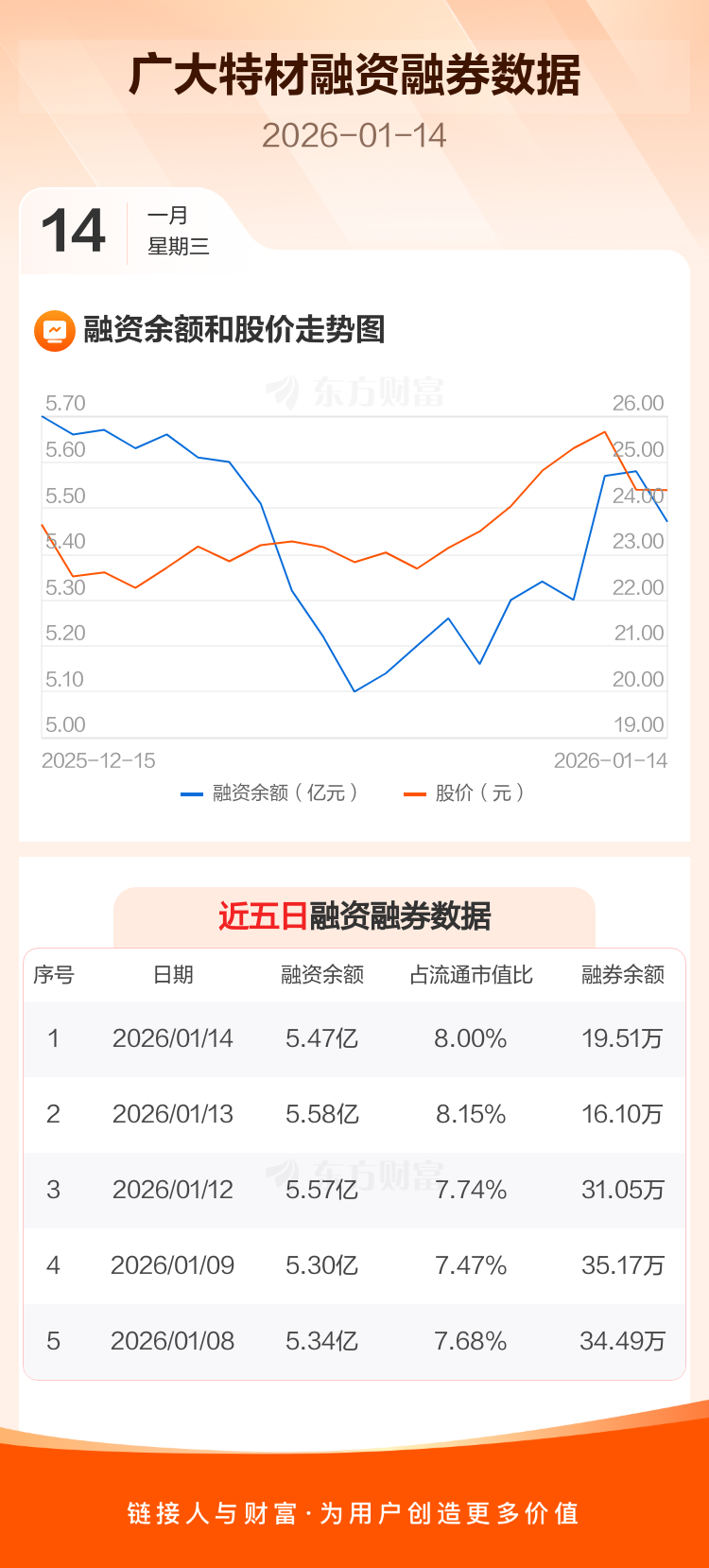 交易所最新数据显示,广大特材于2026年1月14日获融资买入4667.60万元,融资偿还5728.29万元,当日融资净偿还1060.68万元。目前,该股融资余额5.47亿,占流通市值比例为8.00%。