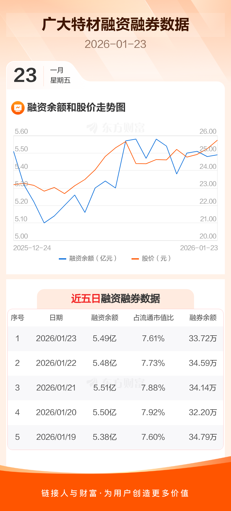 交易所最新数据显示,广大特材于2026年1月23日获融资买入3691.24万元,融资偿还3544.15万元,当日融资净买入147.09万元。目前,该股融资余额5.49亿,占流通市值比例为7.61%。