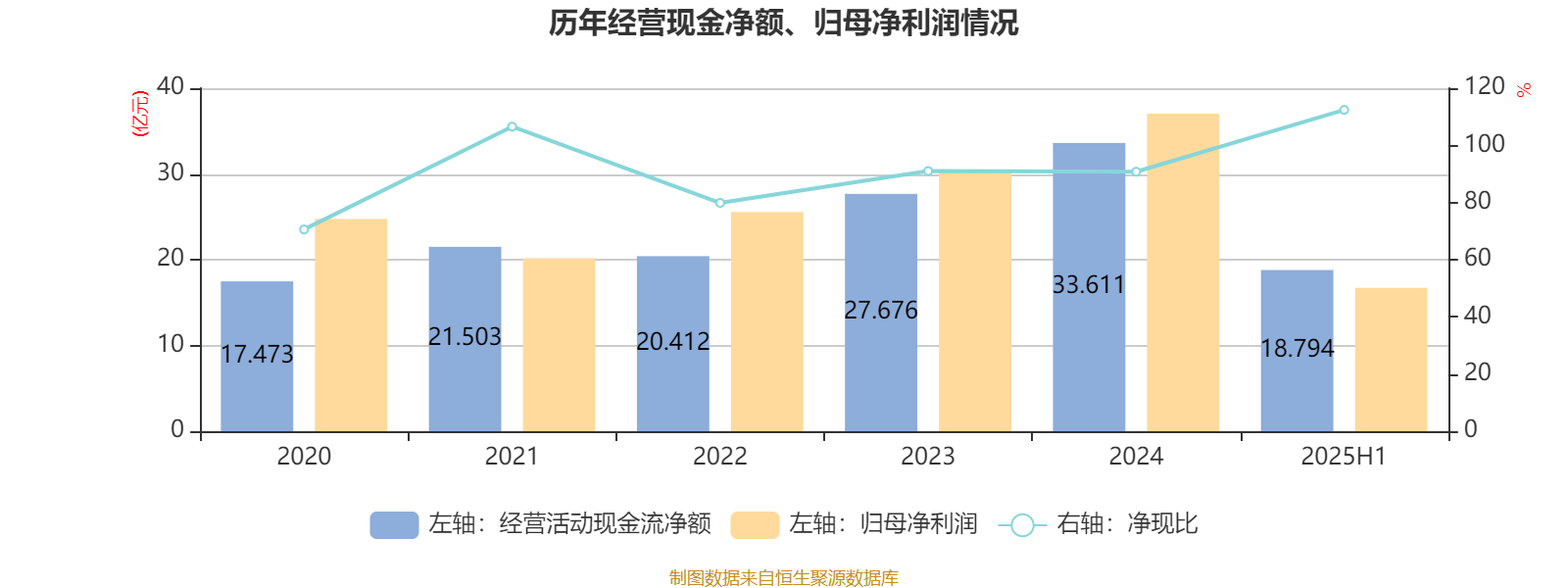 2025年上半年,公司经营活动现金流净额为18.79亿元;筹资活动现金流净额11.32亿元;投资活动现金流净额-51.23亿元。