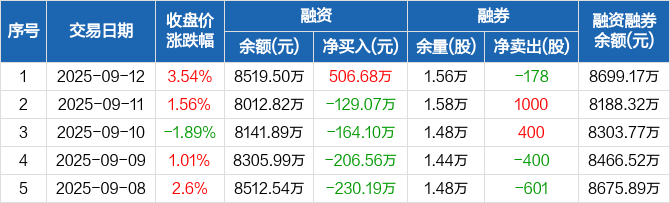 云路股份:融资净买入506.68万元,融资余额8519.5万元(09-12)