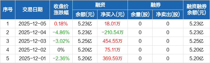 智洋创新:融资净买入18.01万元,融资余额5.23亿元(12-05)