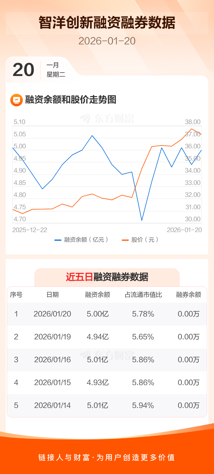 交易所最新数据显示,智洋创新于2026年1月20日获融资买入2103.88万元,融资偿还1528.47万元,当日融资净买入575.41万元。目前,该股融资余额5.00亿,占流通市值比例为5.78%。