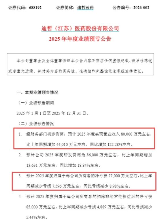 近日,迪哲(江苏)医药股份有限公司(下称“迪哲医药”,股票代码:688192.SH)发布的2025年业绩预亏公告显示,公司营收预计8亿元,同比增长122.28%。尽管营收翻倍,全年净亏损仍达7.7亿元左右,扣非亏损8.5亿元,高额研发投入是持续吞噬利润的主因。