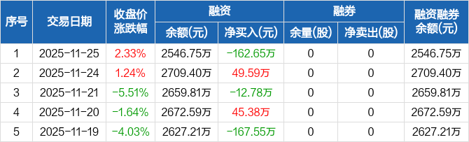融资方面,当日融资买入109.6万元,融资偿还272.24万元,融资净偿还162.65万元。融券方面,融券卖出0股,融券偿还0股,融券余量0股,融券余额0元。融资融券余额合计2546.75万元。