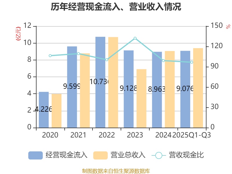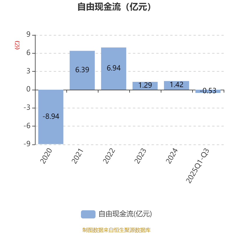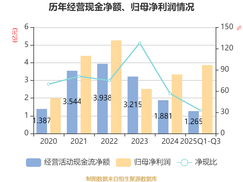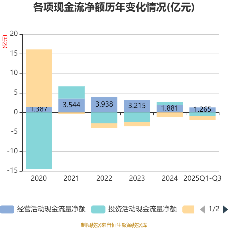 2025年前三季度,公司经营活动现金流净额为1.26亿元,同比增长622.34%;筹资活动现金流净额-9803.77万元,同比减少776.68万元;投资活动现金流净额-9697.5万元,上年同期为9408.23万元。