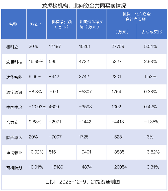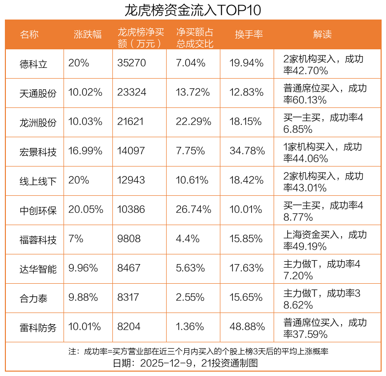 12月9日,上证指数下跌0.37%,深证成指下跌0.39%,创业板指上涨0.61%。盘后龙虎榜数据显示,共有50只个股因当日异动登上龙虎榜,资金净流入最多的是德科立(688205.SH),达3.53亿元。