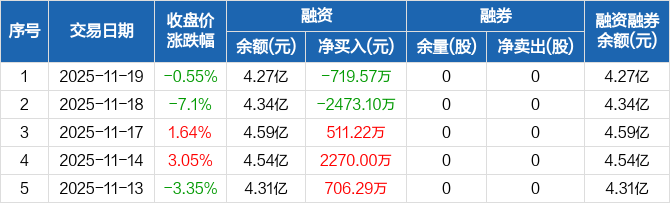 统联精密:融资净偿还719.57万元,融资余额4.27亿元(11-19)