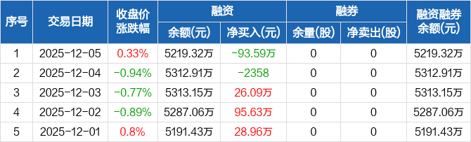 中科微至:融资净偿还93.59万元,融资余额5219.32万元(12-05)
