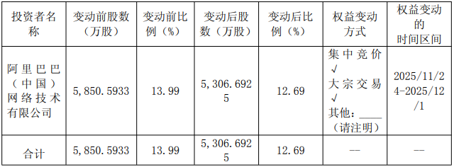 此后,阿里网络在2025年10月9日至2025年10月24日通过上海证券交易系统大宗交易累计减持公司股份1,812,307股,减持比例为0.4333%。2025年11月6日至2025年11月17日,阿里网络通过大宗交易方式减持公司股份4,239,200股,占公司总股本的比例由15.00%减少至13.99%,权益变动触及1%刻度。