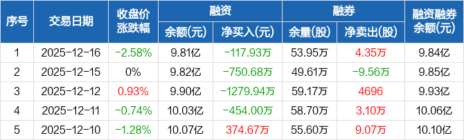 融资方面,当日融资买入2107.76万元,融资偿还2225.69万元,融资净偿还117.93万元,连续4日净偿还累计2602.55万元。融券方面,融券卖出8.68万股,融券偿还4.33万股,融券余量53.95万股,融券余额285.41万元。融资融券余额合计9.84亿元。