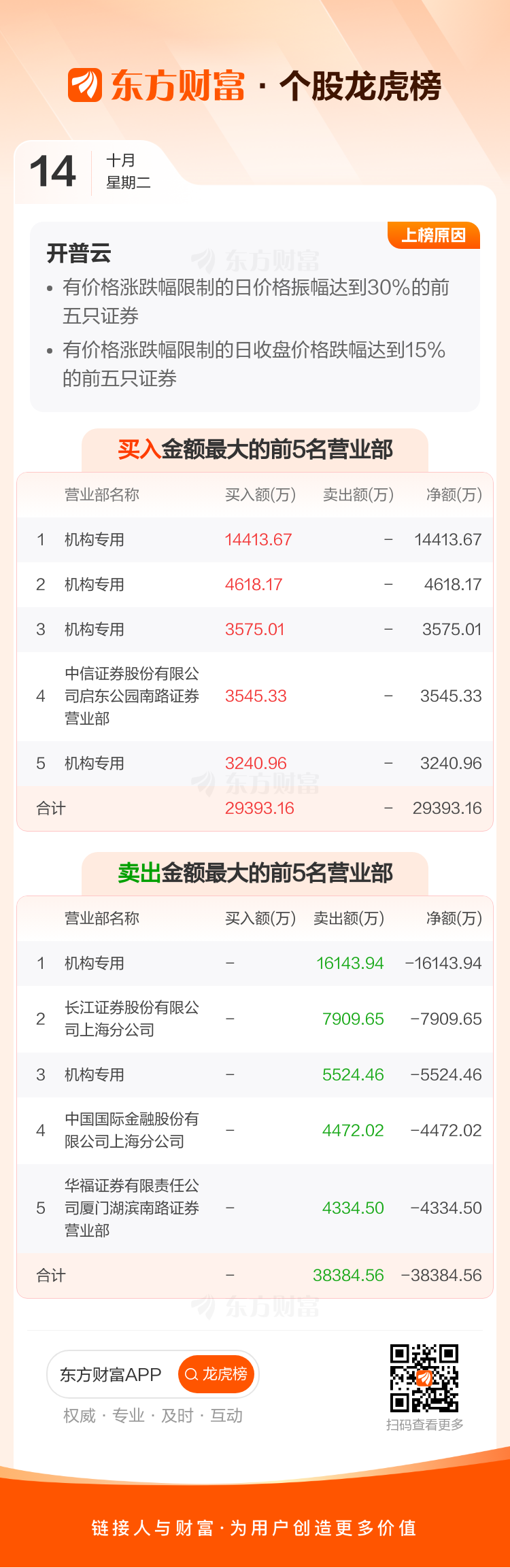 交易所2025年10月14日公布的交易公开信息显示,开普云因成为有价格涨跌幅限制的日价格振幅达到30%的前五只证券、有价格涨跌幅限制的日收盘价格跌幅达到15%的前五只证券上榜。开普云当日收报192元,涨跌幅-17.17%,偏离值40.21%,换手率12.02%,成交额17.77亿。