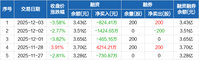 融资方面,当日融资买入3788.81万元,融资偿还4613.22万元,融资净偿还824.41万元,连续3日净偿还累计2714.22万元。融券方面,融券卖出200股,融券偿还0股,融券余量200股,融券余额1.24万元。融资融券余额合计3.43亿元。