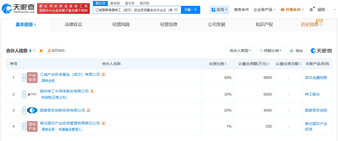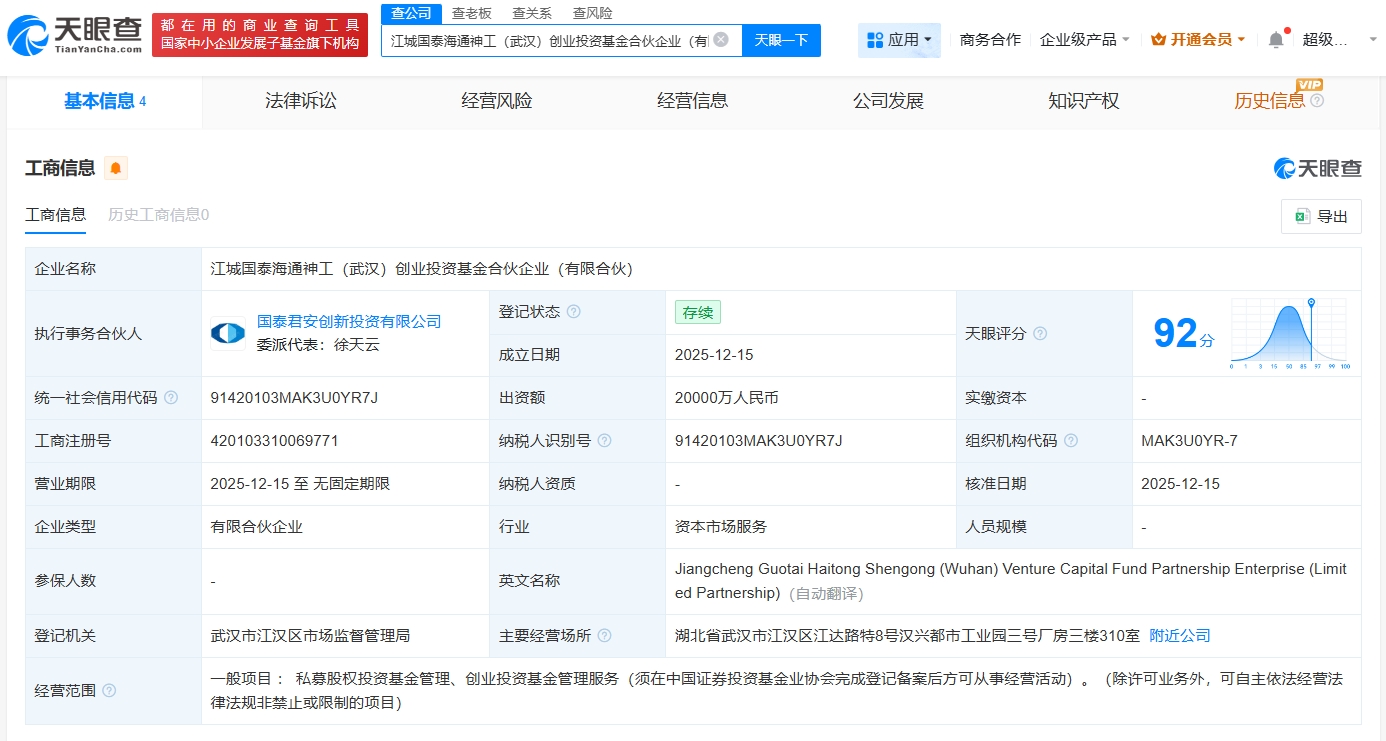 每经AI快讯,天眼查工商信息显示,近日,江城国泰海通神工(武汉)创业投资基金合伙企业(有限合伙)成立,执行事务合伙人为国泰君安创新投资有限公司,出资额2亿元人民币,经营范围为私募股权投资基金管理、创业投资基金管理服务。合伙人信息显示,该基金由江城产业投资基金(武汉)有限公司、神工股份(688233)、国泰海通旗下国泰君安创新投资有限公司等共同出资。