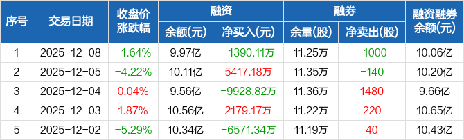 天岳先进:融资净偿还1390.11万元,融资余额9.97亿元(12-08)