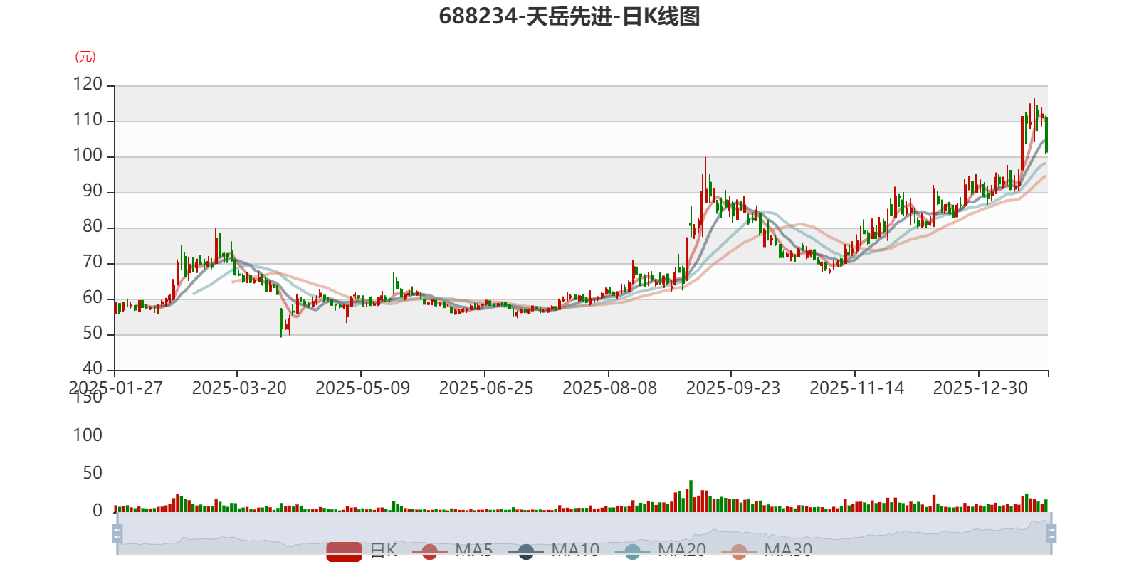 中证智能财讯天岳先进(688234)1月26日晚间披露2025年度业绩预告,预计2025年实现营业收入14.5亿元至15亿元,同比下降15.17%-17.99%;归母净利润亏损1.85亿元至2.25亿元,上年同期盈利1.79亿元;扣非净利润亏损2.35亿元至2.75亿元,上年同期盈利1.56亿元。以最新收盘价计算,市净率(LF)约6.62倍,市销率(TTM)约33.27倍。