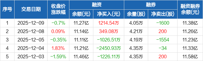 融资方面,当日融资买入6979.19万元,融资偿还5764.65万元,融资净买入1214.54万元。融券方面,融券卖出200股,融券偿还1800股,融券余量4.05万股,融券余额1123.98万元。融资融券余额合计11.38亿元。