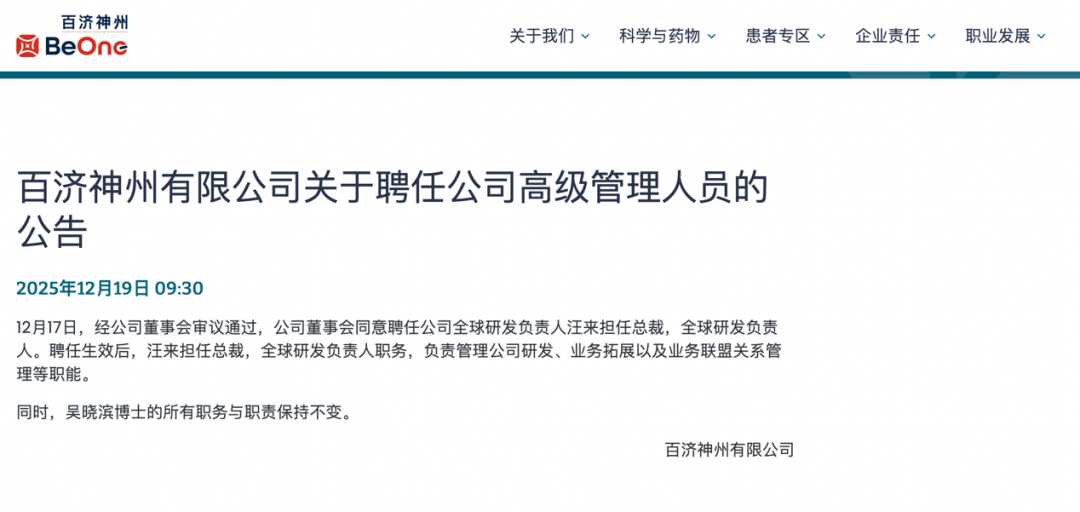 12月18日晚间,百济神州公告称,公司董事会同意聘任其全球研发负责人汪来担任公司总裁,全球研发负责人。聘任生效后,汪来担任公司总裁,全球研发负责人职务,负责管理公司研发、业务拓展以及业务联盟关系管理等职能。