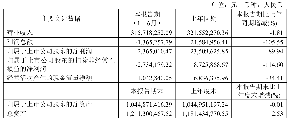 2025年上半年,公司实现营业总收入3.16亿元,同比下降1.81%;归母净利润236.5万元,同比下降89.94%;扣非净利润亏损273.42万元,上年同期盈利1872.59万元。
