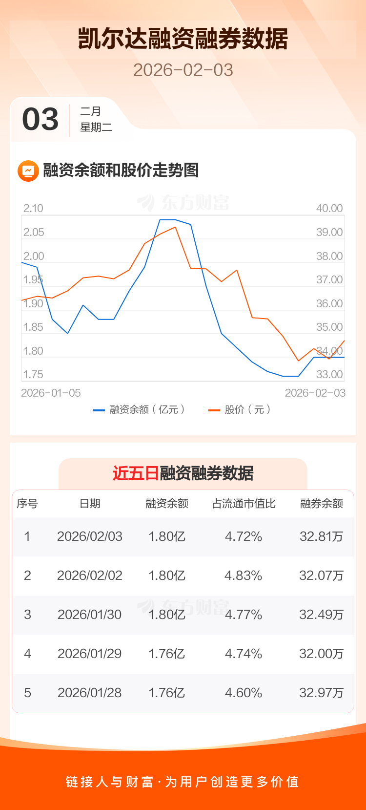 交易所最新数据显示,凯尔达于2026年2月3日获融资买入1140.95万元,融资偿还1145.06万元,当日融资净偿还4.11万元。目前,该股融资余额1.80亿,占流通市值比例为4.72%。