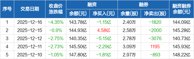 寒武纪:融资净偿还1.15亿元,融资余额143.78亿元(12-16)