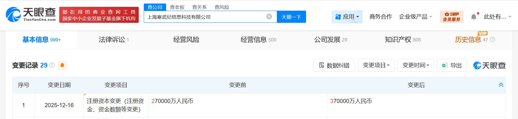 上海寒武纪信息科技公司增资至37亿元,增幅约37%