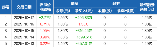 凯立新材:融资净偿还406.83万元,融资余额1.26亿元(10-17)