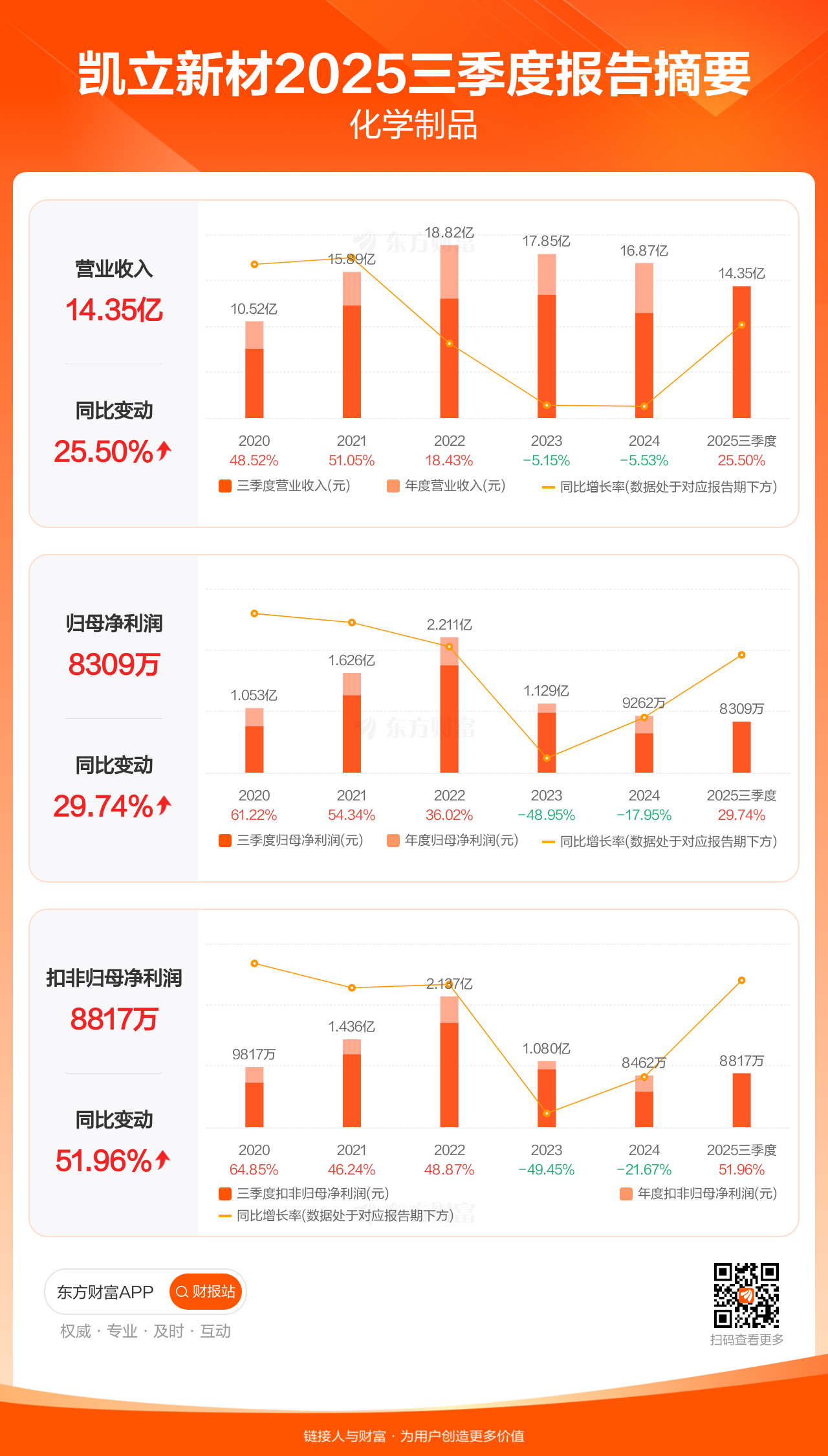 凯立新材10月29日发布2025年三季报显示,公司前三季实现营业收入14.35亿元,同比增长25.50%;归母净利润8308.93万元,同比增长29.74%;扣非归母净利润8816.88万元,同比增长51.96%。