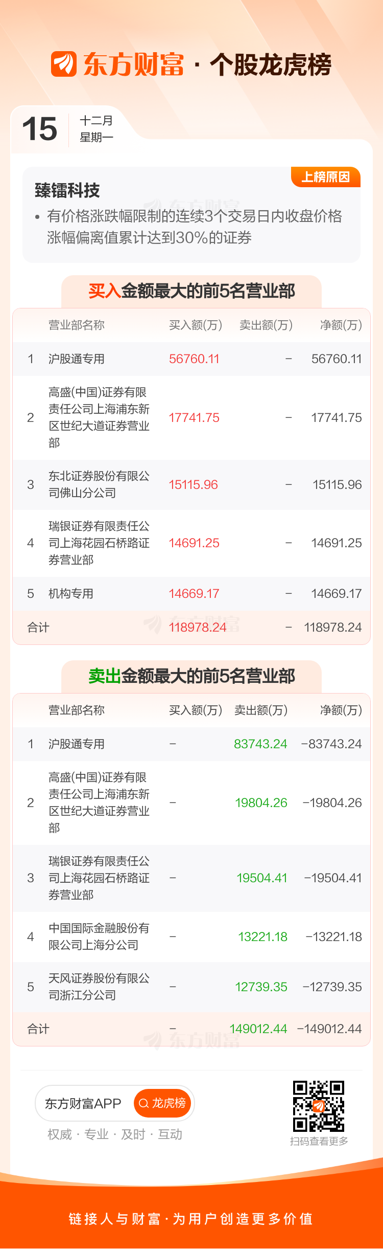 交易所2025年12月15日公布的交易公开信息显示,臻镭科技因成为有价格涨跌幅限制的连续3个交易日内收盘价格涨幅偏离值累计达到30%的证券上榜。臻镭科技当日收报105.57元,涨跌幅12.07%,换手率16.02%,成交额34.51亿。异常期间12月11日至12月15日,期间涨幅36.38%,累计偏离值38.44%,区间成交额99.22亿。