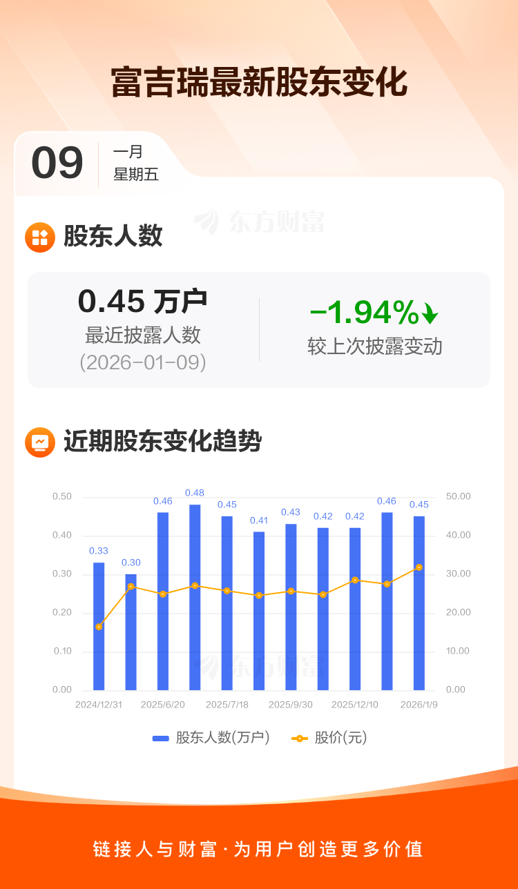 富吉瑞最新披露数据显示,截至1月9日公司股东户数为4509户,较上期(2025年12月19日)减少89户,降幅为1.94%。户均持有流通股数量由上期的1.65万股上升至1.69万股,户均持股金额由上期的45.39万元增加至53.60万元。