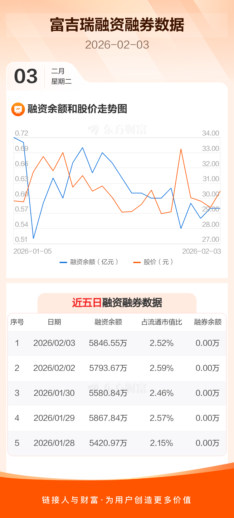 交易所最新数据显示,富吉瑞于2026年2月3日获融资买入451.40万元,融资偿还398.52万元,当日融资净买入52.88万元。目前,该股融资余额5846.55万,占流通市值比例为2.52%。
