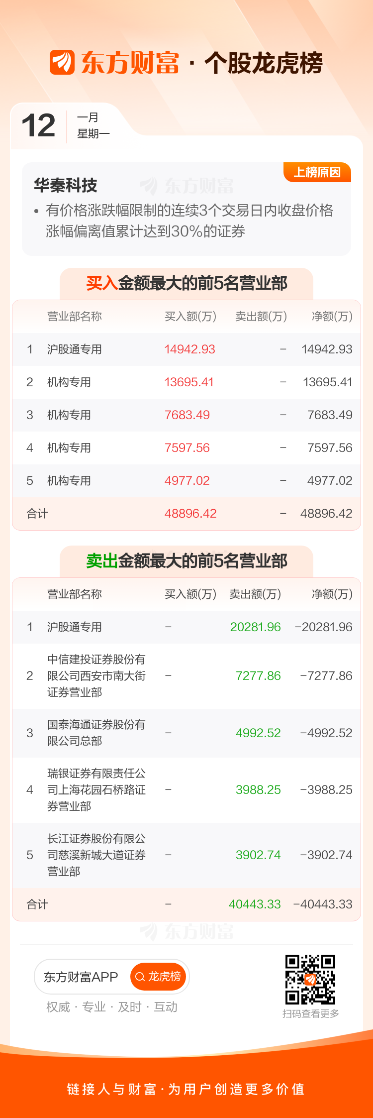 交易所2026年1月12日公布的交易公开信息显示,华秦科技因成为有价格涨跌幅限制的连续3个交易日内收盘价格涨幅偏离值累计达到30%的证券上榜。华秦科技当日收报104.01元,涨跌幅12.29%,换手率3.75%,成交额10.00亿。异常期间1月8日至1月12日,期间涨幅38.24%,累计偏离值33.50%,区间成交额21.43亿。