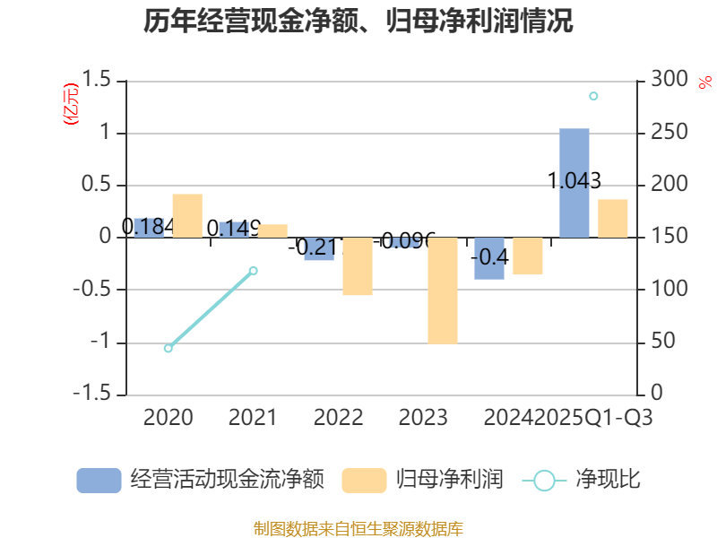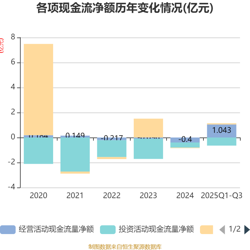 2025年前三季度,公司经营活动现金流净额为1.04亿元,同比增加1.78亿元;筹资活动现金流净额935.41万元,同比增加1599.77万元;投资活动现金流净额-6480.32万元,上年同期为-4799.97万元。