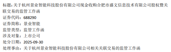 9月30日,上交所下发景业智能现金收购合肥市盛文信息技术有限公司股权暨关联交易的监管工作函。此次监管工作函的发布,无疑将引发市场对于景业智能此次关联交易的高度关注。