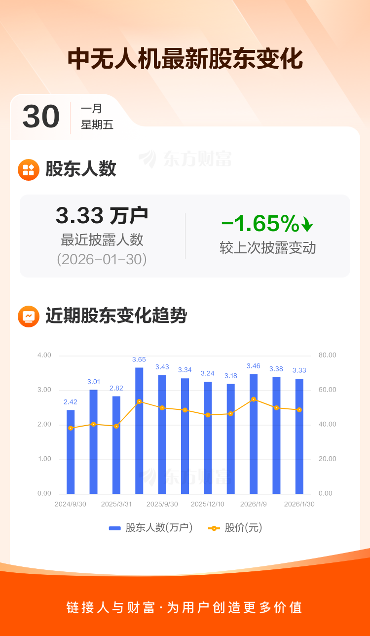 中无人机:截至1月30日最新股东户数3.33万户,较上期减少1.65%