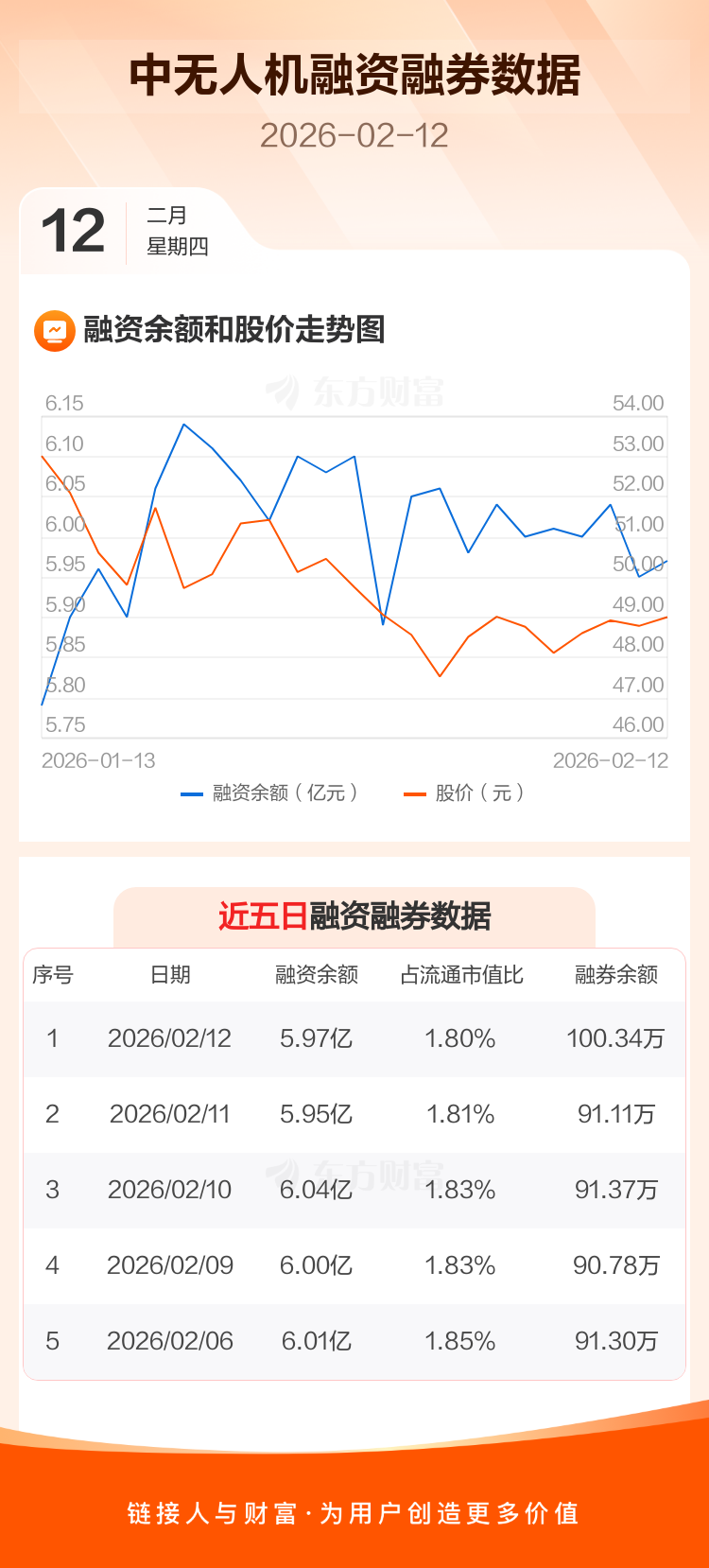 交易所最新数据显示,中无人机于2026年2月12日获融资买入2685.58万元,融资偿还2482.91万元,当日融资净买入202.68万元。目前,该股融资余额5.97亿,占流通市值比例为1.80%。
