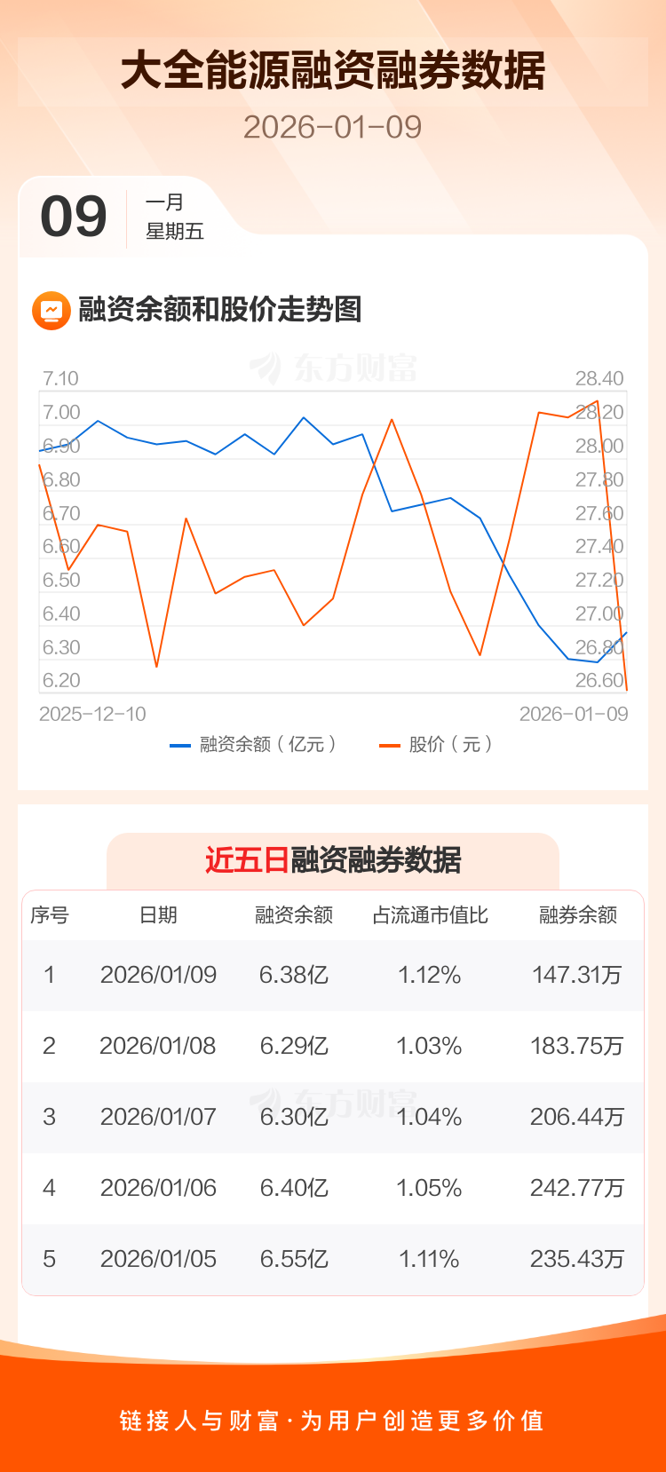 交易所最新数据显示,大全能源于2026年1月9日获融资买入9372.56万元,融资偿还8450.36万元,当日融资净买入922.2万元。目前,该股融资余额6.38亿,占流通市值比例为1.12%。