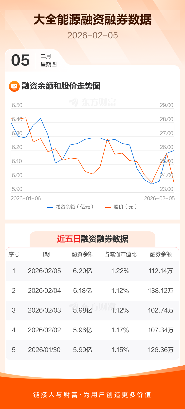 交易所最新数据显示,大全能源于2026年2月5日获融资买入5505.44万元,融资偿还5299.20万元,当日融资净买入206.23万元。目前,该股融资余额6.20亿,占流通市值比例为1.22%。