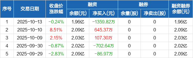 欧科亿:融资净偿还1359.82万元,融资余额1.96亿元(10-13)