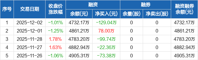恒誉环保:融资净偿还129.04万元,融资余额4732.17万元(12-02)