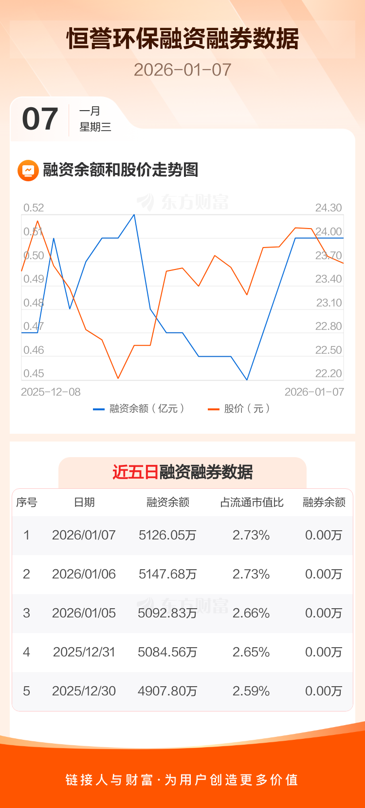交易所最新数据显示,恒誉环保于2026年1月7日获融资买入246.15万元,融资偿还267.78万元,当日融资净偿还21.63万元。目前,该股融资余额5126.05万,占流通市值比例为2.73%。