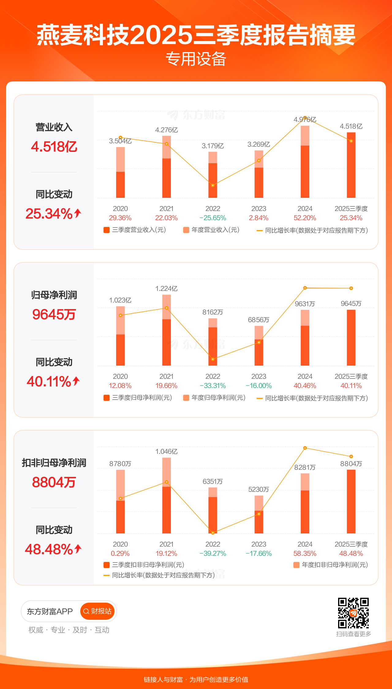 燕麦科技10月28日发布2025年三季报显示,公司前三季实现营业收入4.52亿元,同比增长25.34%;归母净利润9644.54万元,同比增长40.11%;扣非归母净利润8804.49万元,同比增长48.48%。