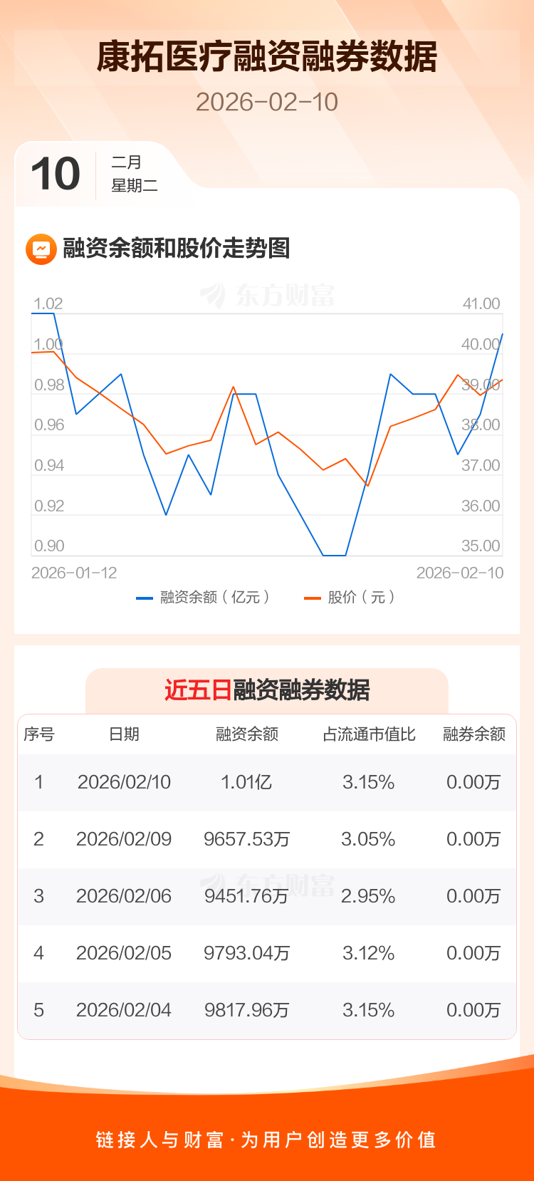 交易所最新数据显示,康拓医疗于2026年2月10日获融资买入804.64万元,融资偿还400.03万元,当日融资净买入404.62万元。目前,该股融资余额1.01亿,占流通市值比例为3.15%。