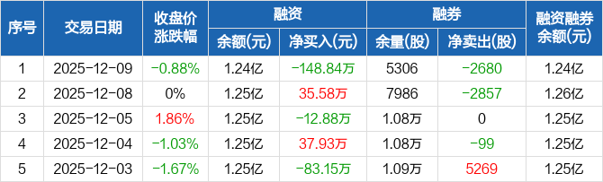 融资方面,当日融资买入287.03万元,融资偿还435.87万元,融资净偿还148.84万元。融券方面,融券卖出300股,融券偿还2980股,融券余量5306股,融券余额7.19万元。融资融券余额合计1.24亿元。