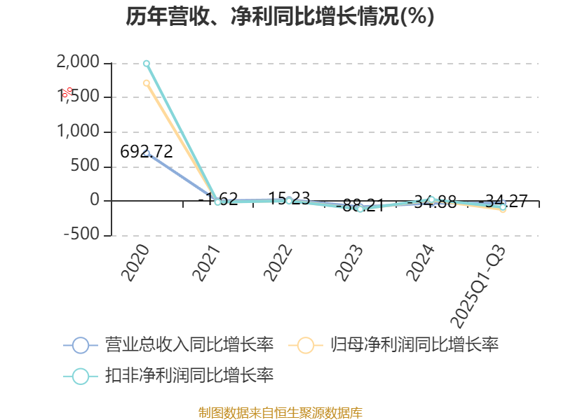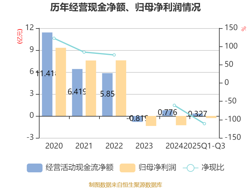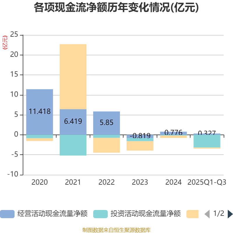 2025年前三季度,公司经营活动现金流净额为3267.24万元,同比下降23.89%;筹资活动现金流净额-2684.78万元,同比增加962.63万元;投资活动现金流净额-3.19亿元,上年同期为-2053.99万元。