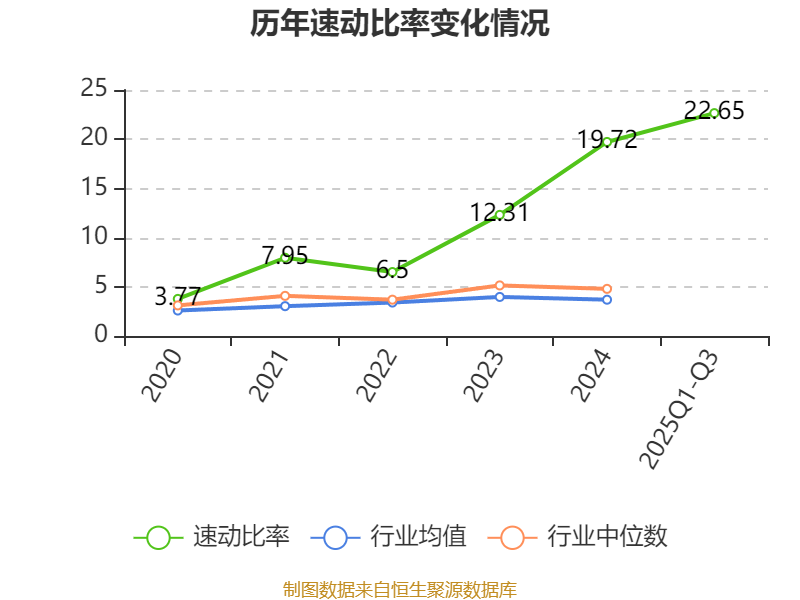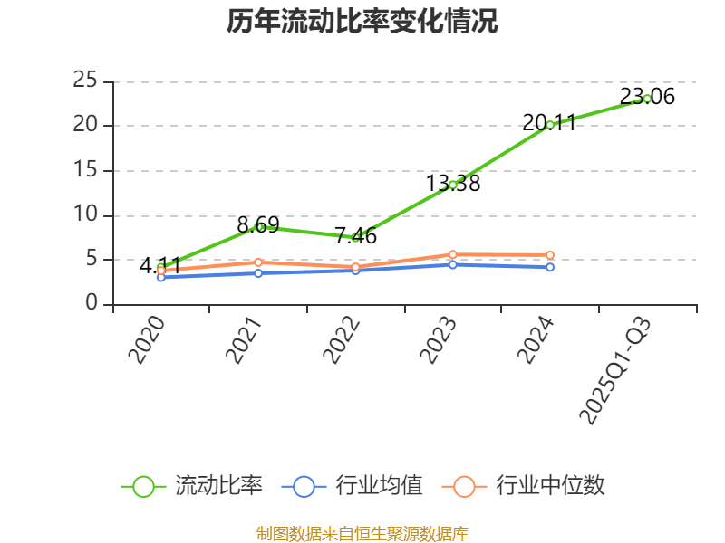 2025年前三季度,公司流动比率为23.06,速动比率为22.65。