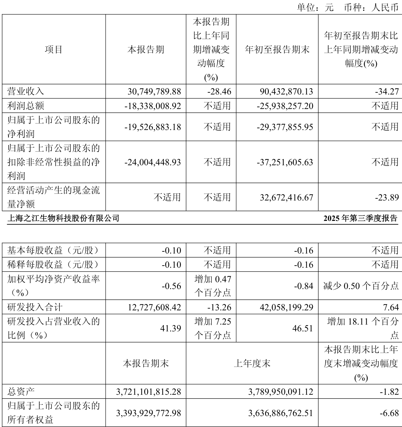 中证智能财讯之江生物(688317)10月30日披露2025年第三季度报告。前三季度公司实现营业总收入9043.29万元,同比下降34.27%;归母净利润亏损2937.79万元,上年同期亏损1300.96万元;扣非净利润亏损3725.16万元,上年同期亏损1930.42万元;经营活动产生的现金流量净额为3267.24万元,同比下降23.89%;报告期内,之江生物基本每股收益为-0.16元,加权平均净资产收益率为-0.84%。
